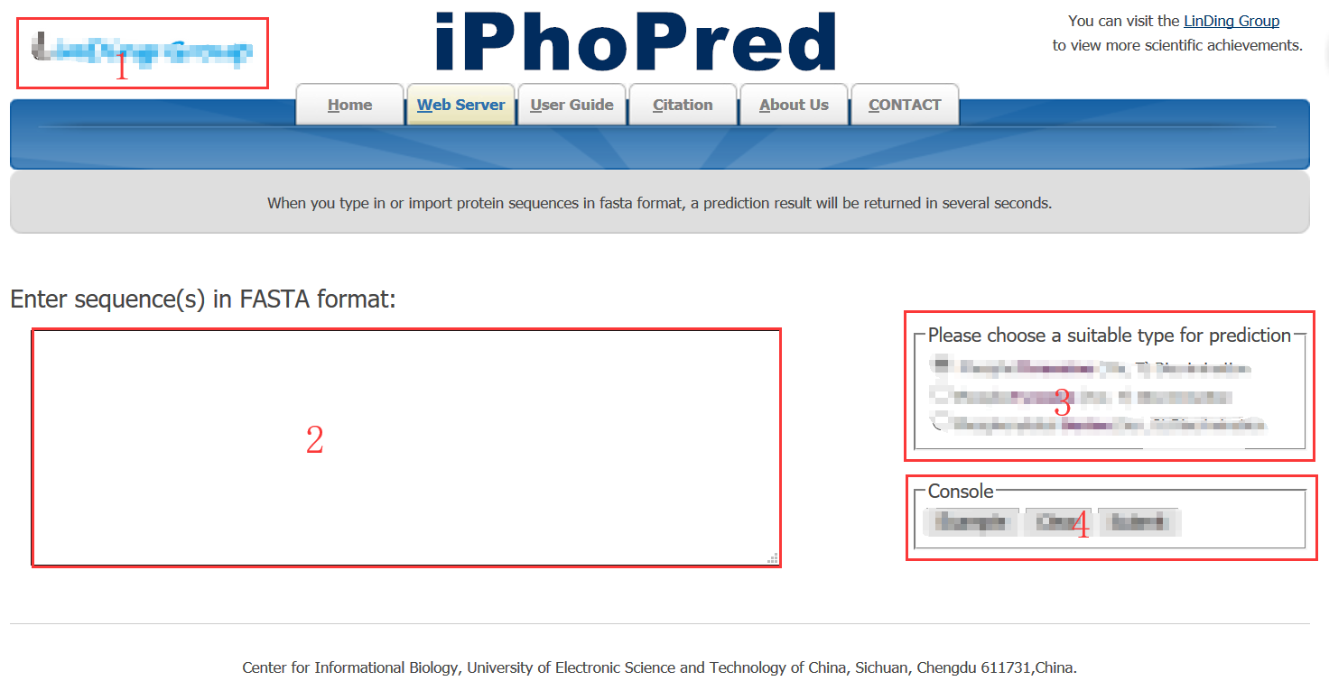 Answer: First, you should upload the protein sequences in fasta format. Secondly, you can choose a type of prediction in the 3-zone position of figure above. Finally, you can click the submit button in area 4 of the map and then wait for the result to appear.